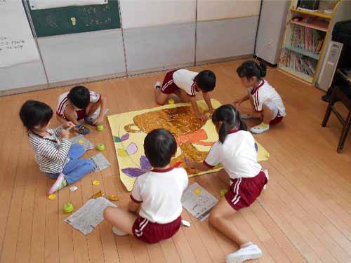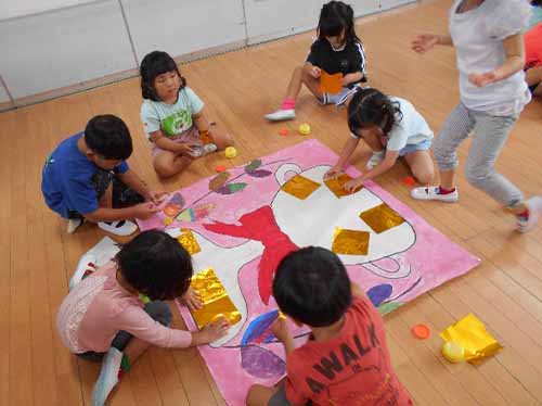 今月は運動会の練習を中心に頑張る中で、障害物競走のパズルづくりを行いました。背景、リボンの色は縦割りごとに3クラスで協力して塗り、葉っぱの色は縦割りのペアと一緒に色を考え丁寧に塗る姿が見られました。最後にぞう組が代表して金色の折り紙でトロフィーの貼り絵を行いました!大きな真っ白のトロフィーを見て「大変そう、」と言いつつもやり始めると「楽しい!」「ここまだ白いよ」とグループの子と一緒に貼り進める姿が見られ、折り紙をダイナミックに貼る子・少しちぎって貼る子など一人一人が考えながら丁寧に貼り進める姿が見られました。完成したものを障害物競走で使うと「うわぁ、きれい!」「うさぎさんとかみんなで作ったからきれいだね」「楽しかった」「またやりたい」など友達と一緒に作る楽しさを感じることができました。