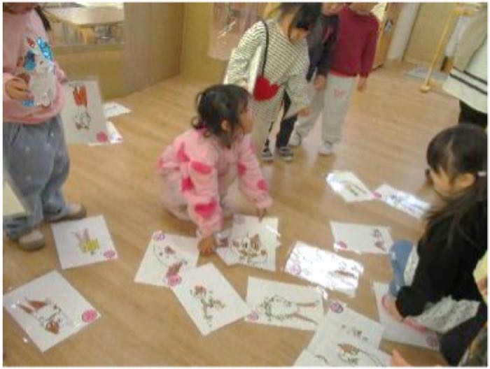 ・3歳児では、大きなかるたにみんなで挑戦。保育者が読み札を読むと、「どこ~!?」と一斉に探し出し、「あった!!」と嬉しそうに見せてくれました。手作りの凧揚げでは、腕を目いっぱい伸ばしながら元気に走り、見事凧が上がると大喜びでした。