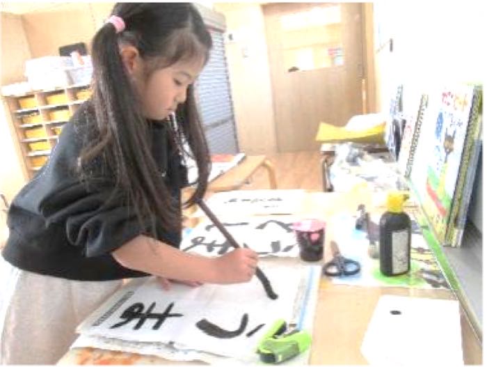 ・5歳児は書初めに挑戦。普段、鉛筆ではスラスラと書き進めている子ども達ですが、鉛筆と筆で書く感覚の違いに戸惑いながらも、真剣な顔つきで取り組み、「できた!」と得意げに見せてくれました。