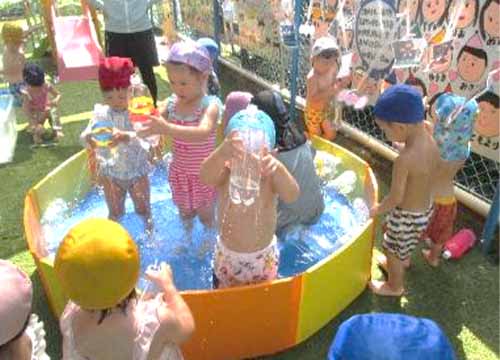 7月に引き続き8月も感触遊びやプールなどの夏ならではの遊びを楽しみました。感触遊びとは様々な素材に触れ、その感触の違いを楽しむ遊びの事です。今回は保育園で実際に行った感触遊びの様子を紹介したいと思います♪0歳児クラスでは氷遊びを楽しみました。手に持つと氷の冷たさに驚きながらもバケツやコップに入れて楽しみ、徐々に溶けていく様子を不思議そうに見つめていました。1歳児クラスでは春雨遊びを楽しみました。普段食べている春雨に色がついていることに最初は驚いた表情を見せる子もいましたが、手でちぎったり、手のひらに乗せてみたりと思い思いに楽しむ様子が見られました。2歳児クラスでは泡遊びを楽しみました。保育者が泡だて器で混ぜるともこもこと泡立つ様子に大盛り上がりで、保育者や友達と一緒に顔や体に塗り広げて楽しむ様子が見られました。