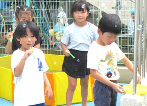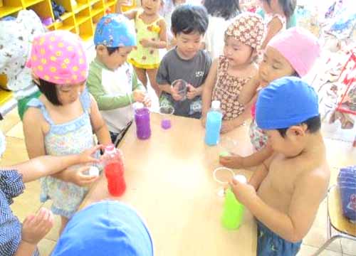 3歳児は、好きな色でセンサリーボトルを作り、色の変化を楽しんでいました。4歳児はプールで様々な玩具を使い、好きな遊びを見つけて友達と一緒に楽しむことができました。5歳児はしゃぼん玉を作って、しゃんぼん玉を追いかけたり手で触ってこわしてみたり、色々な遊び方をして楽しみました。