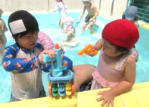 8月に入り、まだまだ暑さは続きますが、それぞれのクラスで夏らしい遊びを楽しんでいます。プール遊びでは、保育者や友達と水をかけ合ったり、顔を水につけてみようとしたり、水の感触に触れることを楽しんでいます。また、ワニ歩きやビート板を使って泳ぐことなど各クラスで色々なことに挑戦し、どんどんレベルアップしていく子ども達。出来ることが増えていき、とても嬉しそうです。