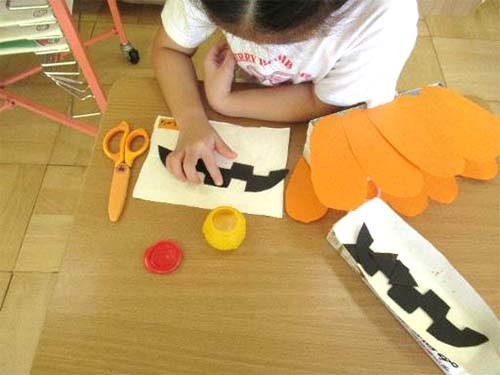 ハロウィンが大好きな子ども達。3.4.5歳児はハロウィンの製作を楽しみました。3歳児はおばけやねこなど、自分の好きなハロウィンのキャラクターを選んでお面を作りました。透明テープに色んな色の画用紙を自由に貼り、目や口を付けていき、完成した作品を見て子ども達はとても喜んでいました。4歳児はかぼちゃのカバンを作りました。かぼちゃや形が複雑な口や目などのパーツもはさみで上手に切っていきました。自分だけのオリジナルのかぼちゃのカバンができました。5歳児は妖怪のお面を作りました。色えんぴつで好きな色で塗っていき、自分の好きな妖怪のお面を作り、友達同士で見せ合いながら妖怪になりきることを楽しみました。