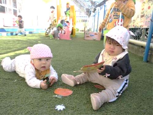 0.1歳児は“秋見つけ”と題して戸外で秋見つけを楽しみました。自分で飾り付けをしたお気に入りのカバンを持って準備完了!張り切って戸外へ出ると、たくさんの果物や木の実に大喜びで、「あったよ!」と嬉しそうに教えてくれました。