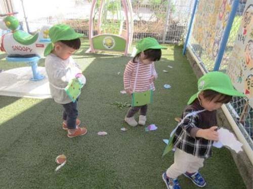 2歳児は八幡神社へ歩いて出掛けました。道路を渡る際も「みぎよし!ひだりよし!」と元気いっぱいの声を響かせながらみんなで確認し、道の途中で草花を見つけると大盛り上がりの道中でした。公園ではみんなでおやつを食べて、たくさん遊んだ子ども達。園に戻ると、戸外へ出てみんなでお弁当を食べました。いつもと違う雰囲気と、お家の方が作ってくれたお弁当に大喜びで嬉しそうな笑顔がたくさん見られ、また一つ、楽しい思い出ができました。
