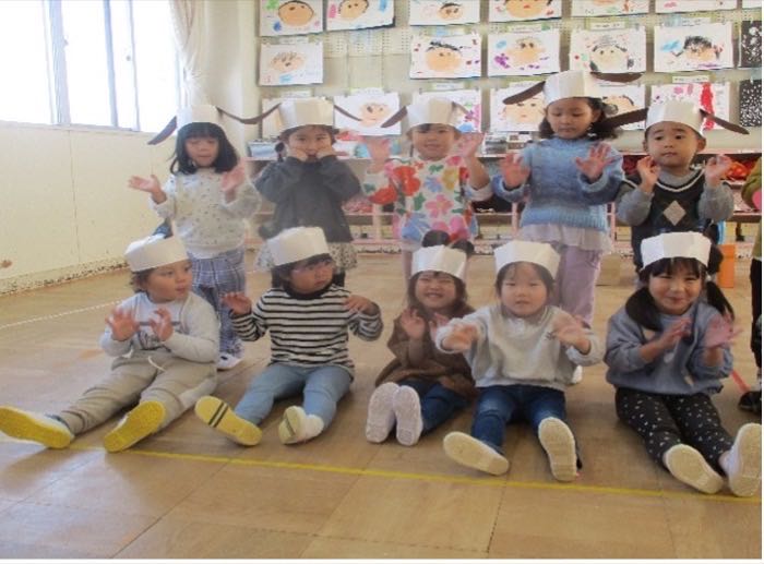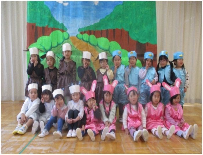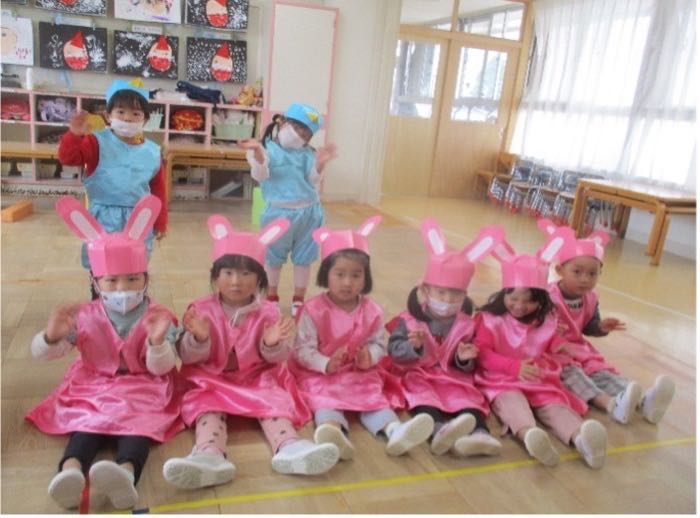 【どうぞのいすりんご組Ver.】を10月から繰り返し楽しんできた子どもたち。最初はセリフや踊りも自信なさそうに、恥ずかしそうにやっている子が多かったのですが、遊びながらみんなで繰り返し練習をすることで「きょうも、げきやる!!」と張り切ってやる姿が増えてきました。練習をやった日は『頑張ったねシール』を貼り、どんどん自信をつけていく子どもたち。本番は緊張している表情の子が多くいましたが終わった後、感想を聞くと「たのしかったぁ!!」と言いう子が沢山いました。今でも遊びながら歌を口ずさんだり踊ったりしている子どもたちです。