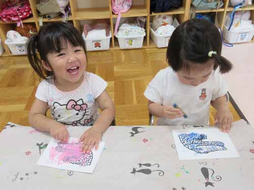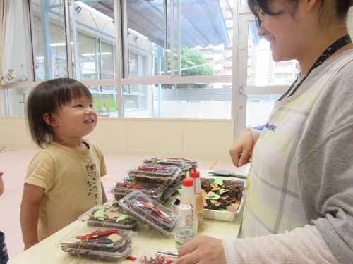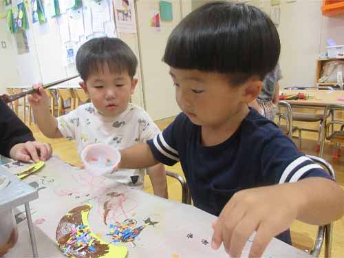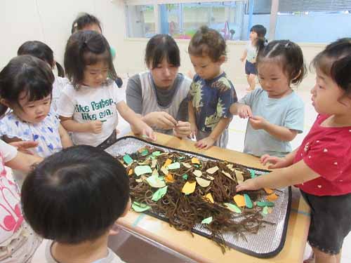 「わにわにのおでかけ」という絵本からお祭りに興味をもち、絵本に出てくるヨーヨーとチョコバナナを作りました。園庭の野菜を見てから、保育士が作った画用紙の野菜を収穫し、手でちぎって鉄板に入れて、みんなで焼きそば作りも楽しみました。作って遊ぶ経験は“楽しい”“もっと作ってみたい”とワクワクがいっぱい!「ください!」とやり取りの言葉も聞こえるようになり、お祭りごっこがどんどん楽しくなってきました。次はどんなお店が増えるのか楽しみです!