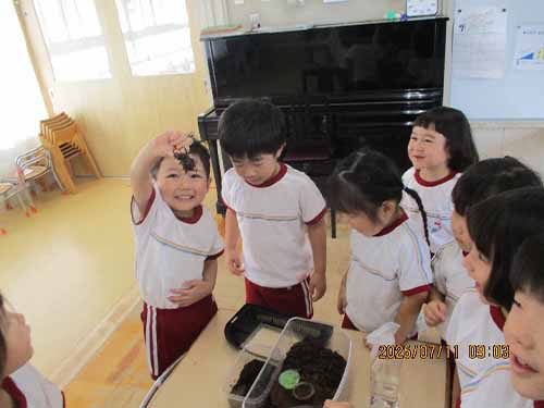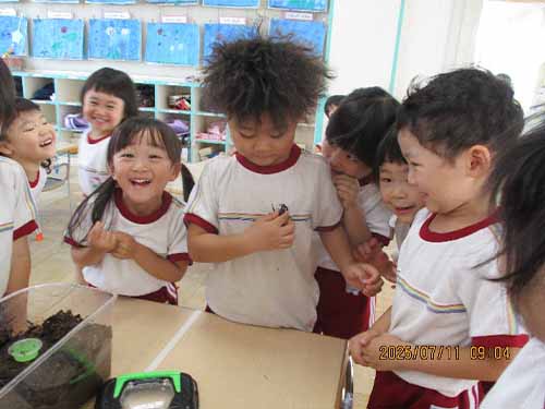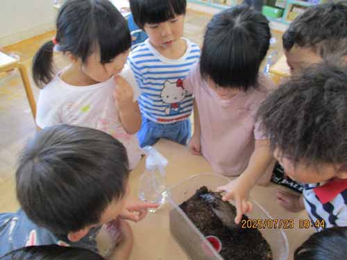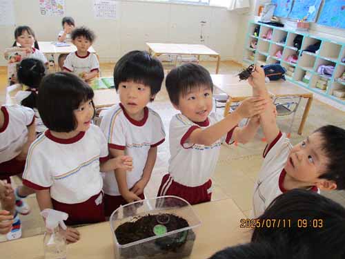 さくらんぼ組からぶどう組に、仲良く一緒に進級したカブトムシさん。クラスの子どもたちと一緒にお世話の仕方を話し合いました。お当番活動が大好きな子どもたちは、その活動の中にカブトムシのお世話をすることに決めました。朝一番の当番活動にカブトムシのお世話が加わったことで、自分の支度を早々と終わらせて、ドキドキワクワクしながら餌や土の状態を確認している子どもたち。クラス全員が小さな命と向き合う大切な時間を持つことができています。