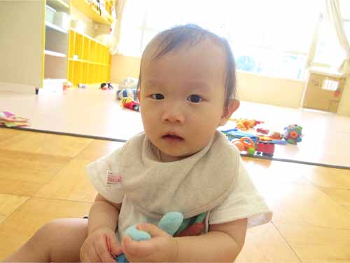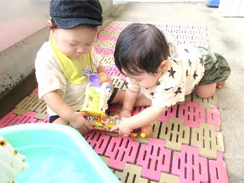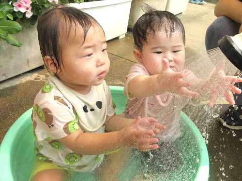 水遊びが始まり、子ども達は保育士と一緒に楽しみながら水遊びをしています。大胆に水をかぶりながら遊ぶ可愛い子ども達。友達とワイワイしながら遊ぶ姿がとても微笑ましいです。また、8月から新しい友達2人を迎え、更にいちご組が賑やかになりました。新しい友達に興味津々な子ども達!すぐに仲良くなりましたよ♪ これからも笑いの絶えない楽しい生活を送っていこうね。