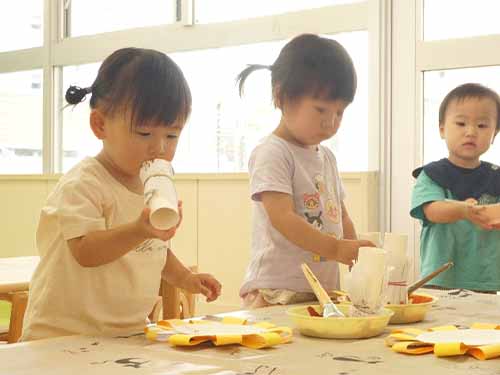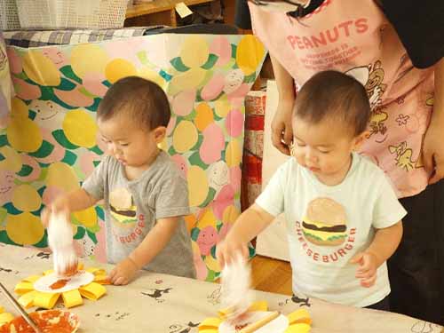 に日に暑くなるばかりですが、子ども達は園生活の中で夏の遊びや製作を楽しんで行いました。ヒマワリの製作では、種の部分を茶色の絵の具でスタンプをしました。同じ所を何回もスタンプする子や、全体にスタンプする子など様々で、作品が出来上がると、満面の笑みで私たちに見せてくれました!
