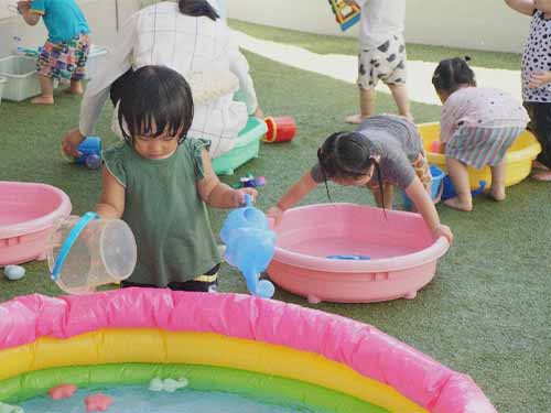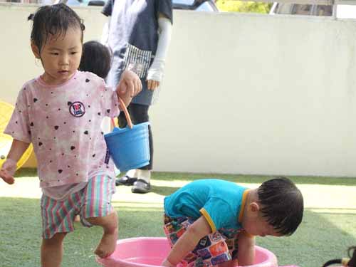 子ども達の大好きな水遊びでは、好きな玩具を持ってきて水を触ったり、バケツの中に入れたりと自分の好きな遊びを見つけて思い思いに水遊びを楽しんでいます。また、シャワーを雨のように上から降らすと、「雨だー!」と喜ぶ姿がありました!