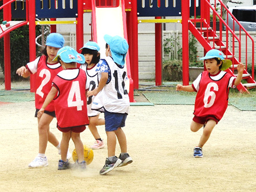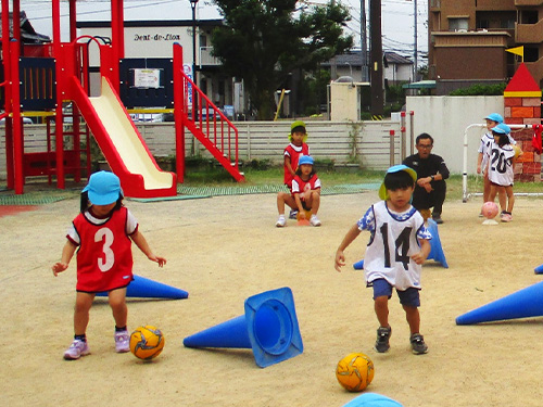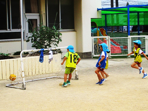 楽しみにしていたサッカー教室。昨年より難しい動きがありましたが、子ども達は楽しそうにボールを蹴っていました。様々な動きで練習をした後、いよいよ試合です。ボールを追いかけるのに必死になり自分のチームのゴールがどちらなのか分からなくなってしまい、オウンゴールをしてしまうこともありましたが、どの子も園庭を走り回り楽しんでいました。もう、次回のサッカー教室で試合をすることを楽しみにしています。