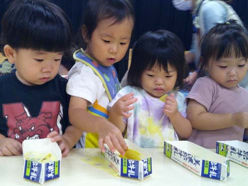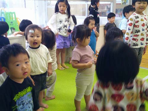 毎日、年長児の友だちと一緒に帰りの会をしています。大きいお兄さん、お姉さんの歌う姿を見て一緒に歌ってみたり、体を揺らしたり、手拍子をしたりしながらとっても楽しそうです♪ 4月当初は、眺めているだけの子どもたちも多かったのですが、今では少しずつ笑顔で口ずさむ姿が見られるようになりました。歌の後は「またあした!」などと元気に挨拶を交わし、友だちや先生にギューッとハグをしています! 年長児との交流を、これからも活発に行っていきたいと思います。今回の写真は、帰りの会の様子と先日行われたこどもフェスティバルの様子です♪