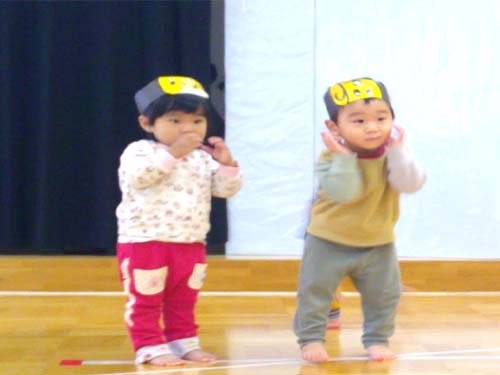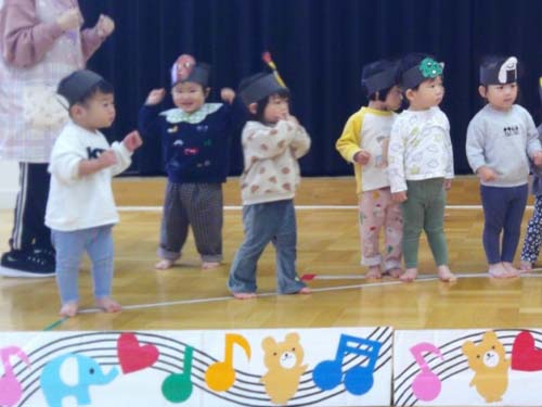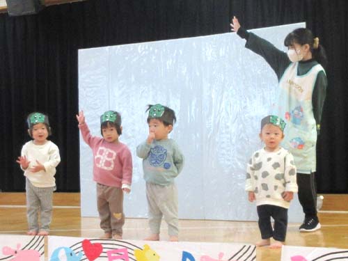 まずはお部屋で曲に合わせて行進や踊り、お返事の練習から始めました。練習を続けていくと、「さんぽ」の曲を聴くだけで友だちと一緒に行進をしたり、「みてー!」と踊りを見せてくれる子どもの姿が増えてきました。最後にはいちご組さんをお客さんに、遊戯室で練習もしました。緊張する子どもの姿もありましたが、しっかりと最後まで発表をして「みてくれてありがとう!」といちご組さんに手を振ることが出来ました!