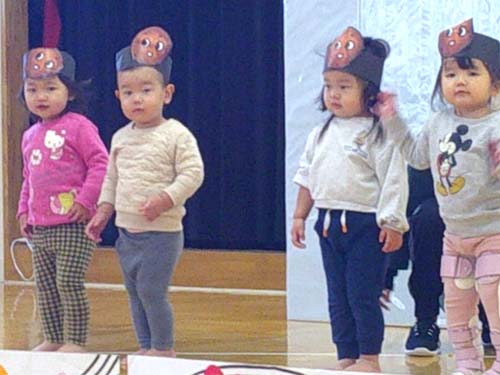 だんだんと冬が近づいて寒くなってきました。そんな中、もも組の子どもたちは11月最後の土曜日の発表会に向けて『おべんとうバス』の練習を頑張っています!