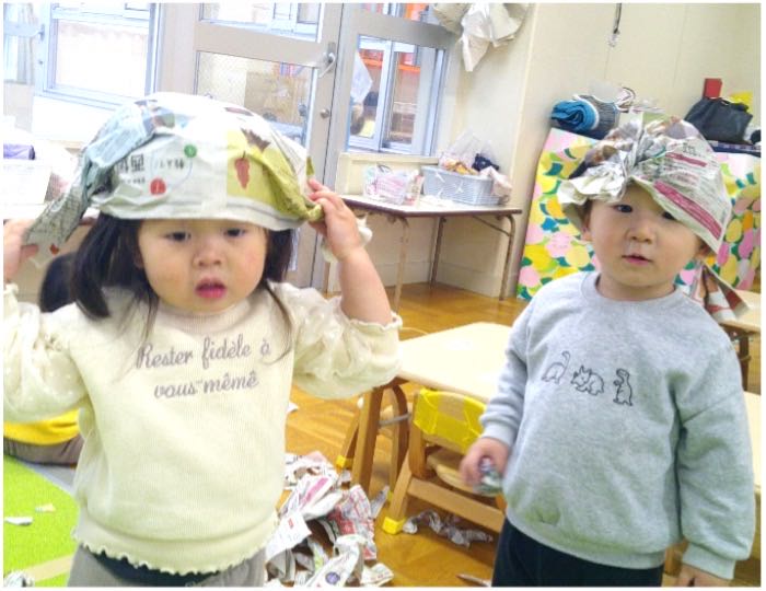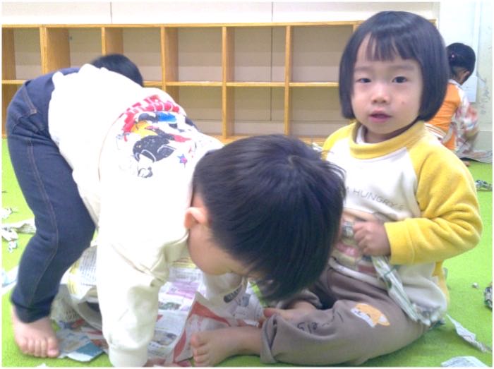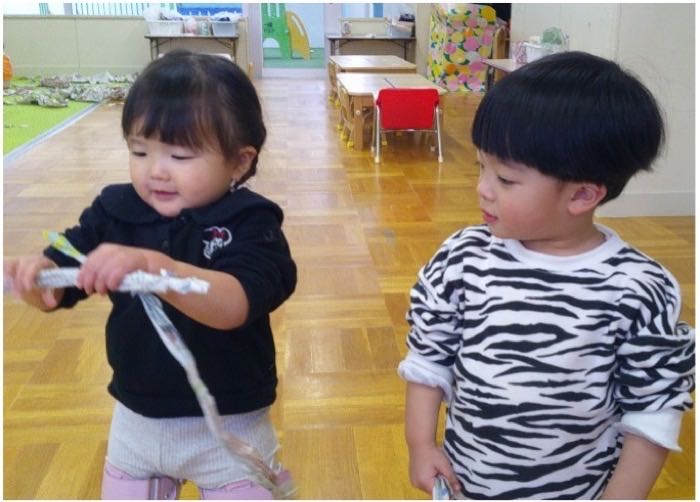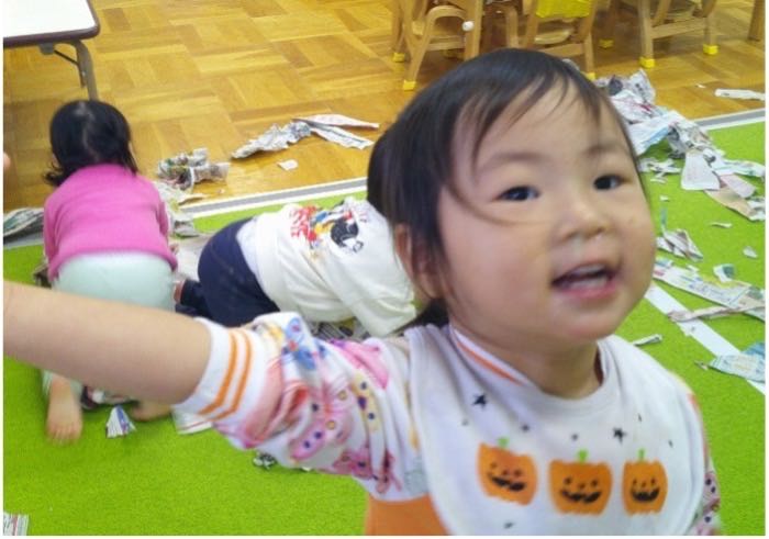 初めて新聞遊びをしました。自分の指先を使って新聞を破ったり、新聞を丸めて棒状にしたりと、各々で色々な遊び方で楽しんでいました。保育士が「キャンディー型の帽子です。いかがですか?」と子どもたちに話すと、「ぼうし!ぼうし!」、「ぼうし、ちょうだい!」などと話す姿が見られました。また、同じ帽子をつけている子同士で笑いあったり、簡単な言葉のやりとりを楽しんだりと友達とのやり取りもしていましたよ。これからも様々な遊びを楽しんでいきたいです!