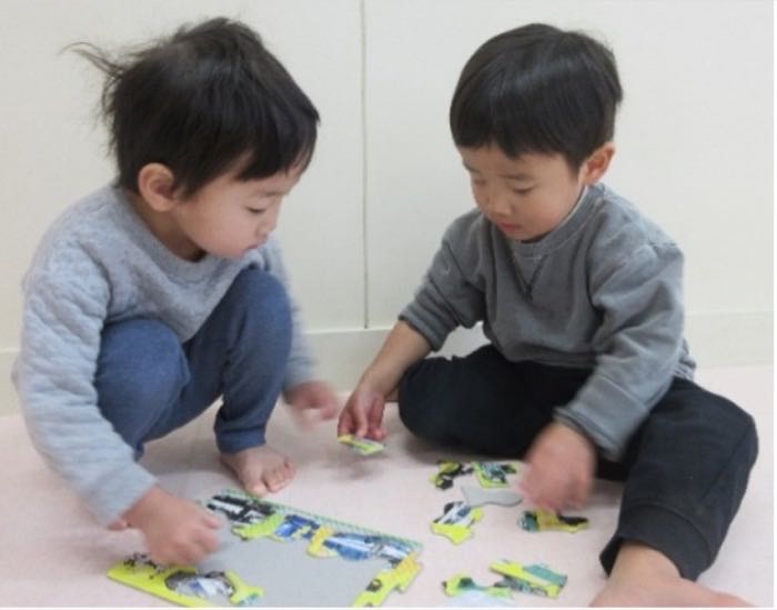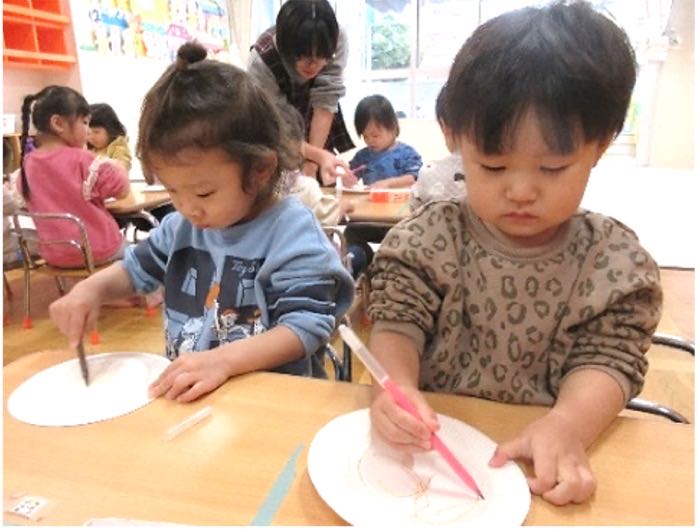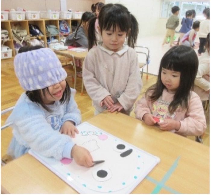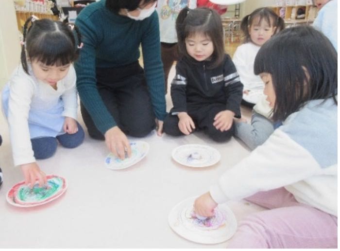 今月はお正月遊びを楽しみました。紙皿に絵を描いて自分のこまを作って“こま回し”をしたり、それ以外にも“福笑い”、“かるた”、“お手玉”など様々な遊びをしました。“こま回し”では、こまを上手く回せるのが嬉しくて友だちと一緒に回したり、保育士に見せてみたりして楽しんでいました。“福笑い”では、できあがった顔がおもしろくて友達や保育士と笑いあう姿が見られました。また、“パズル”でも遊んだのですが、完成させるために友だちと協力し合い一緒にあてはまるピースを探して楽しんでもいました。