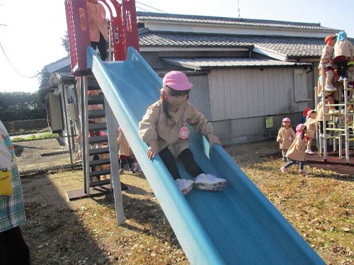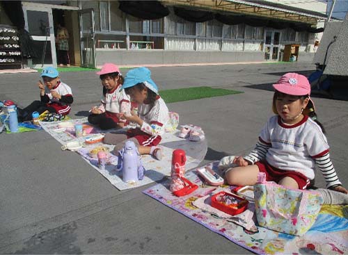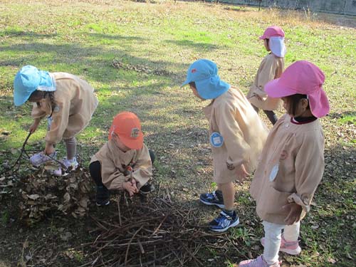 以上児3クラスで、六軒公園まで秋の遠足に出掛けました。朝から「おべんとうにウインナーはいってるよ!」「こうえんでなにしてあそぼうかなー?」とワクワクしていた子どもたち。トイレを済ませて、いざ公園に出発! めろん組のお兄さん、お姉さんに手を繋いでもらい嬉しそうな子どもたちでした。公園では滑り台やブランコ、大きな木の近くで年上の子たちの真似をしてごっこ遊びを楽しんでいました。 たくさん遊んでお腹がすいてきたので園に戻ってお弁当タイム!! みんなで輪になって楽しく、モリモリ食べていましたよ。